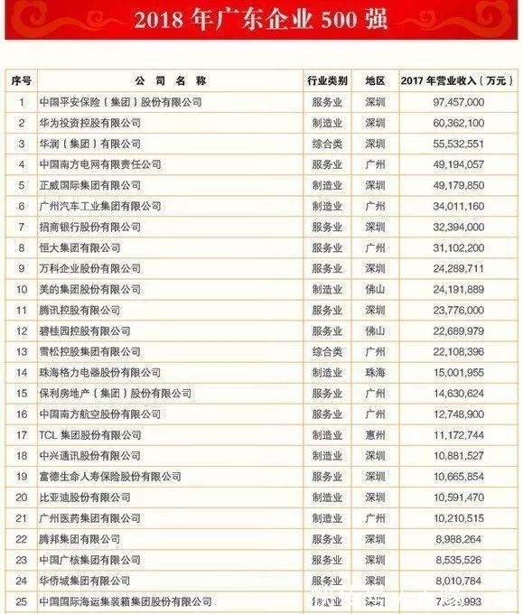 2018年广东省五大领军企业, 深圳包揽前三, 第二是
